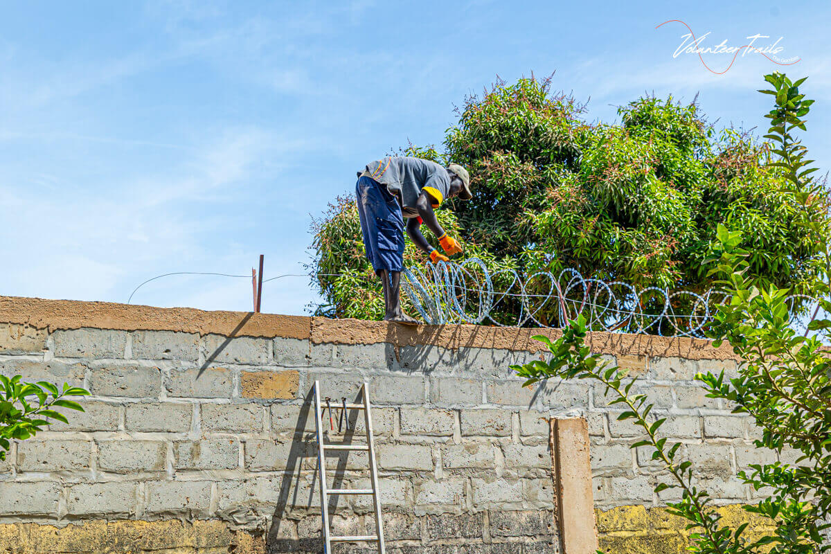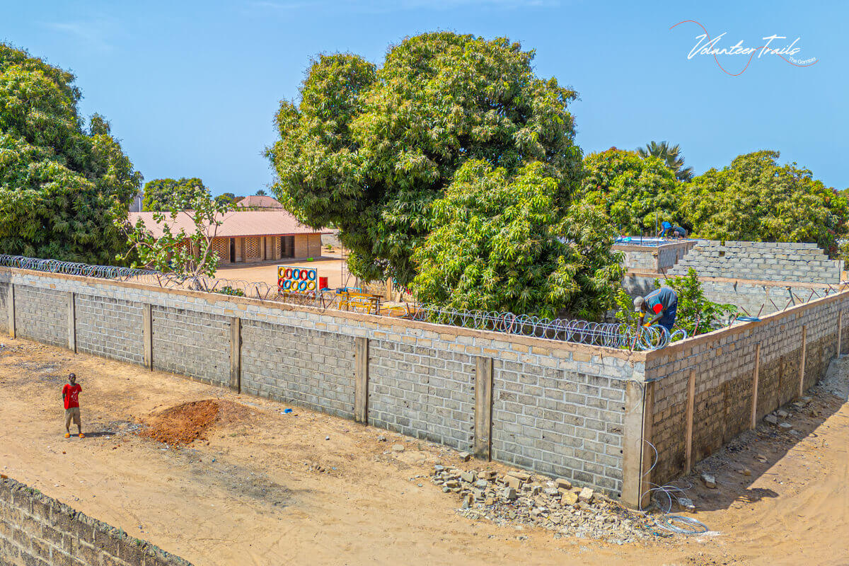 Projekt varnostne zaščite zidu je eden izmed infrastrukturnih projektov, ki ga izvajamo v sklopu našega karierno-izobraževalnega centra v Brufutu. Njegov glavni namen je povečati varnost območja centra, zaščititi objekte ter ustvariti še bolj varno okolje za otroke, prostovoljce in lokalno skupnost, ki ta prostor uporablja vsak dan.