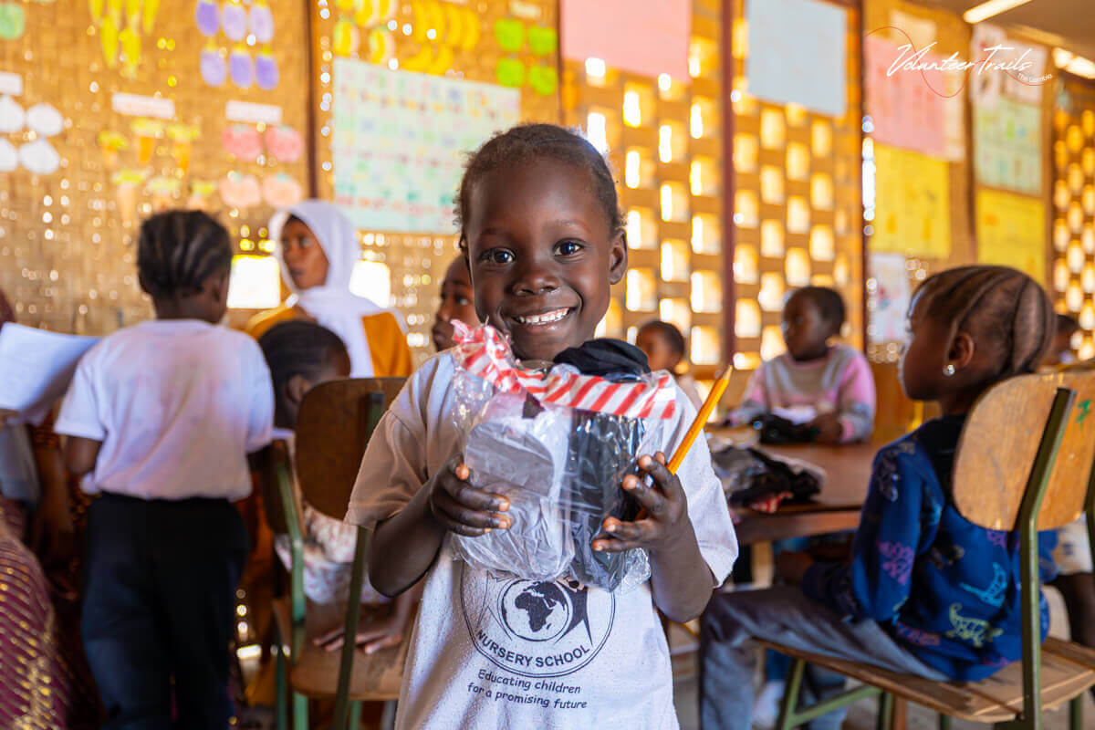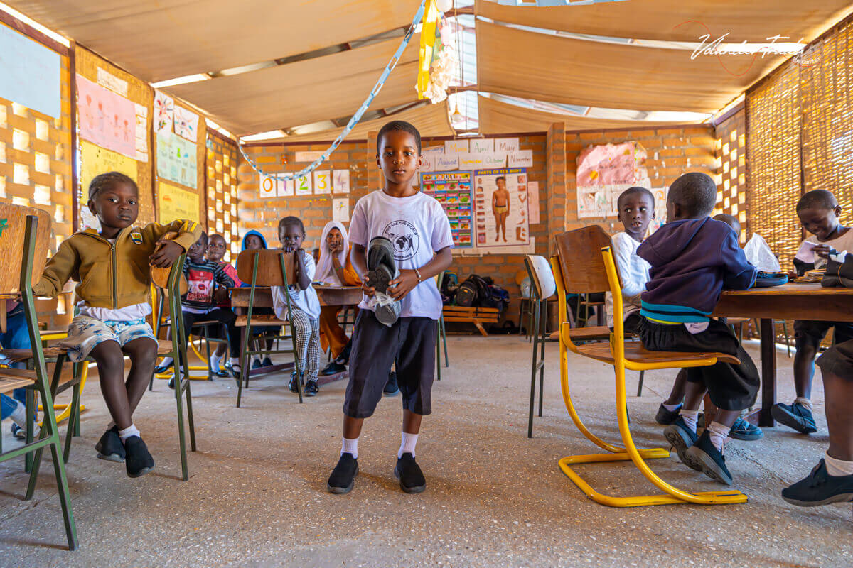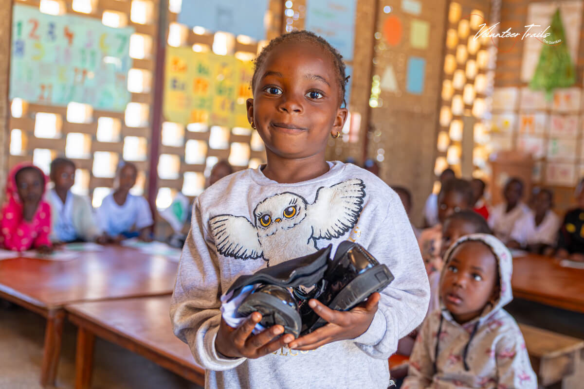 S pomočjo donacij prostovoljke Tine smo lahko v našem vrtcu uresničili nekaj, kar se na prvi pogled zdi zelo preprosto – kupili nove čevlje in nogavičke za vse otroke. A tukaj smo se znova naučili, da tudi najbolj vsakdanje opravilo lahko v Gambiji postane pravi mali projekt, ki zahteva veliko organizacije, iznajdljivosti in predvsem potrpežljivosti.